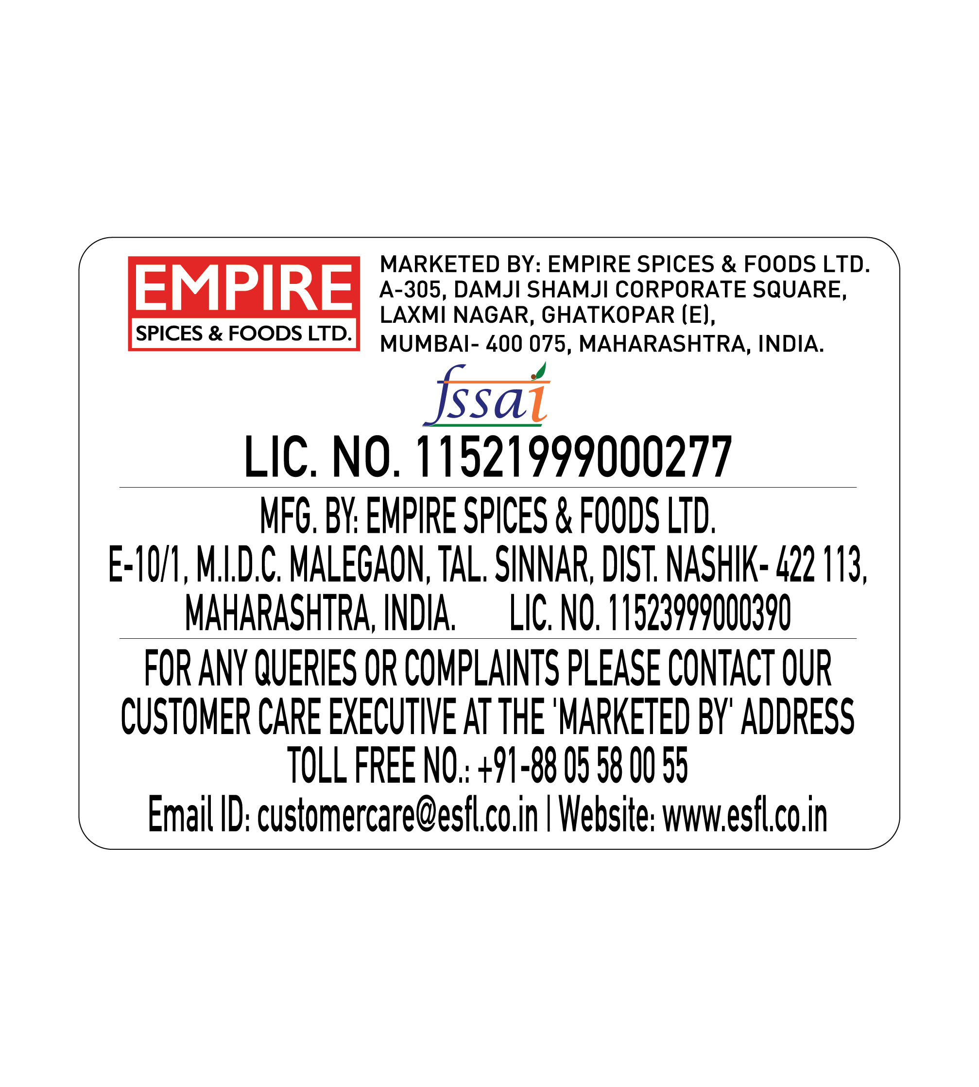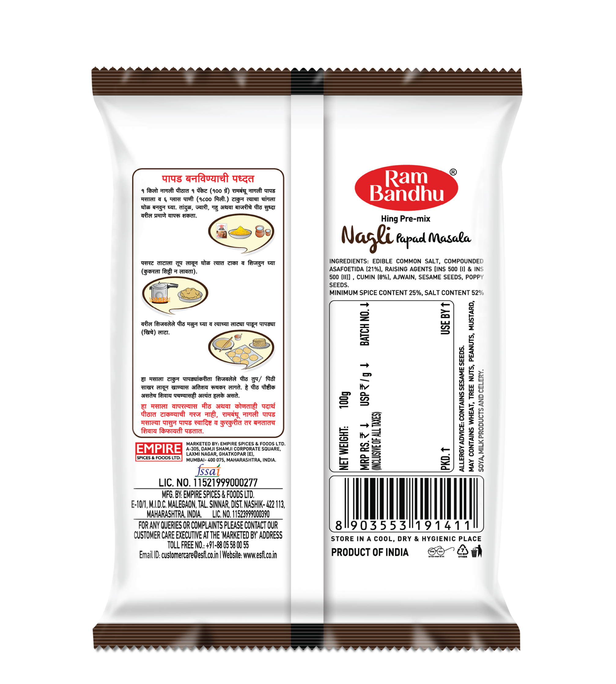 It is the choicest blend of spices to produce the delightful taste that you look for in papads made from Nagli pith. Precise spice proportions blended using carefully selected premium hing (asafoetida), sesame seeds, poppy seeds, cumin, ajwain etc. help you to make impeccable Nagli papads every time.